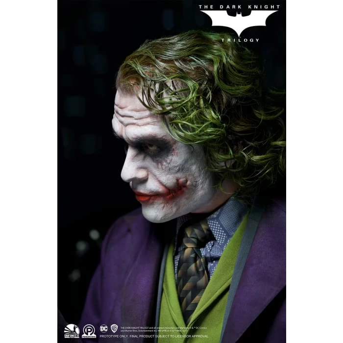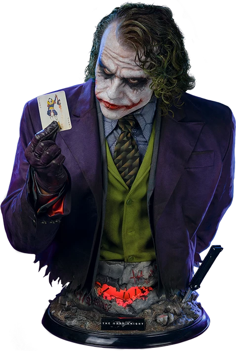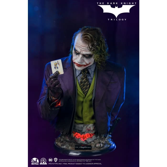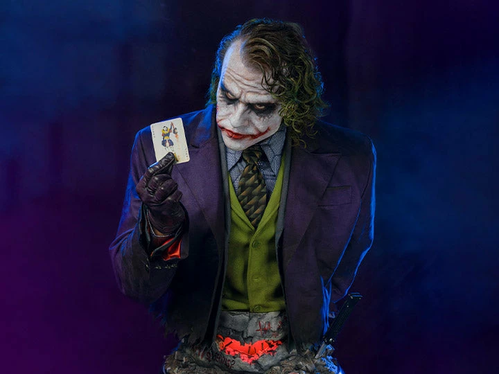 In The Dark Knight in 2008, Heath Ledger performed as an untraceable, unpredictable but charming Joker with his extraordinary acting, and this Joker is beloved by countless audience. The legends will never fade and now Infinity Studio is honored to bring this super villain to real life with our Silicone bust series! By using the latest official data, we achieved highest level of accuracy that has never been, even the material of Joker’s outfit is same to original movie. LED unit is planted in the base, and make the hole looks like a Batman’s signal or a bloody Joker smile. The accessories including his knife and “Joker mask” are all come with the bust, both could be set in his left hand. Every element of this bust is haunted by uncertainties and chaos, but- “Why so serious?”