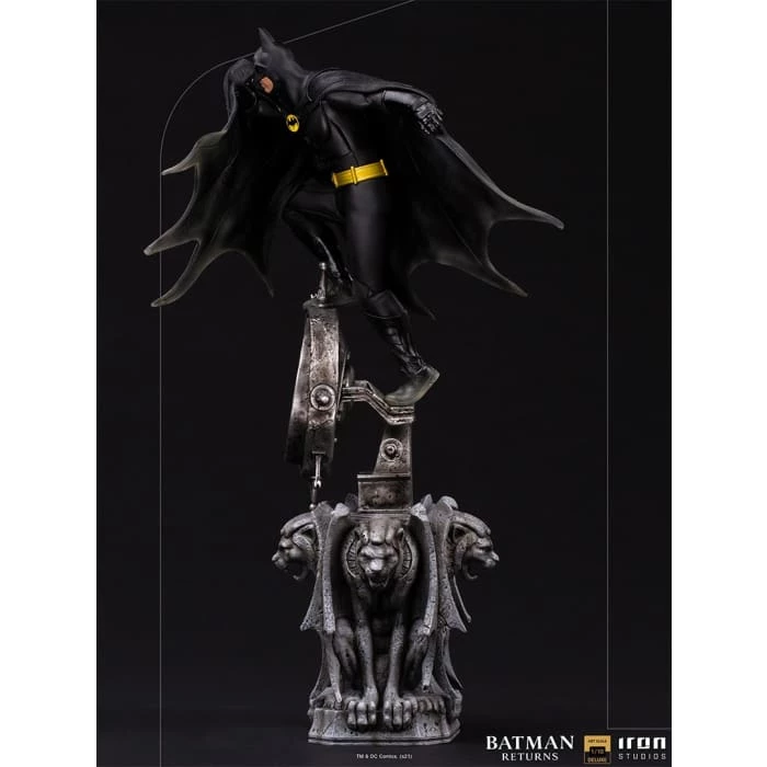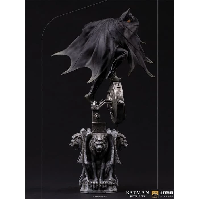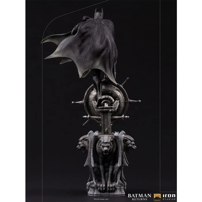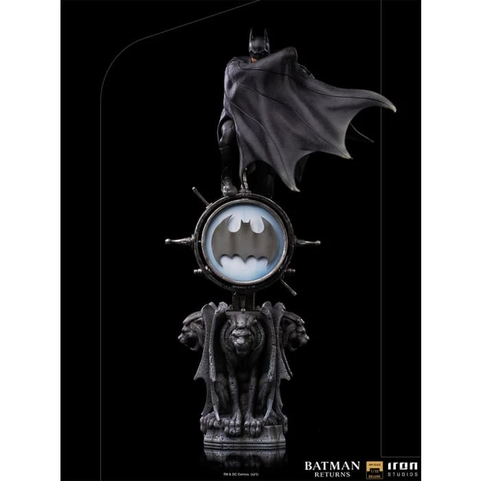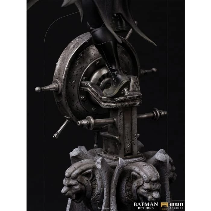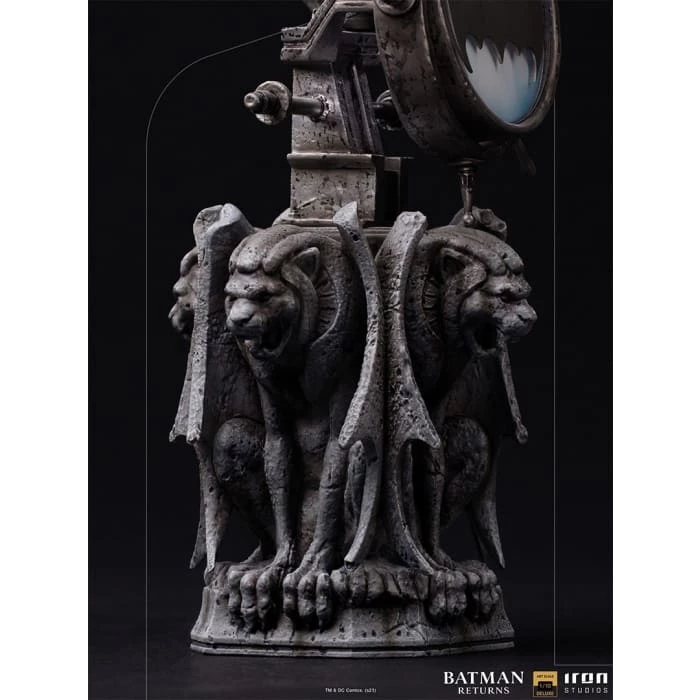 A concrete totem-shaped base, surrounded by gargoyles shaped like Chimeras, serves as a platform for one of Gotham’s most striking symbols, the Bat-signal, which is a powerful spotlight used by law enforcement officers led by the admirable Commissioner Jim Gordon. The Bat sign is used to summon Gotham City’s most dedicated defender. With his symbol reflected in the skies, the Dark Knight answers the call and scales the artifact, hidden by the shadows of his dense black cape that surrounds his body, like the great wings of a bat, symbol of his identity and cause.
