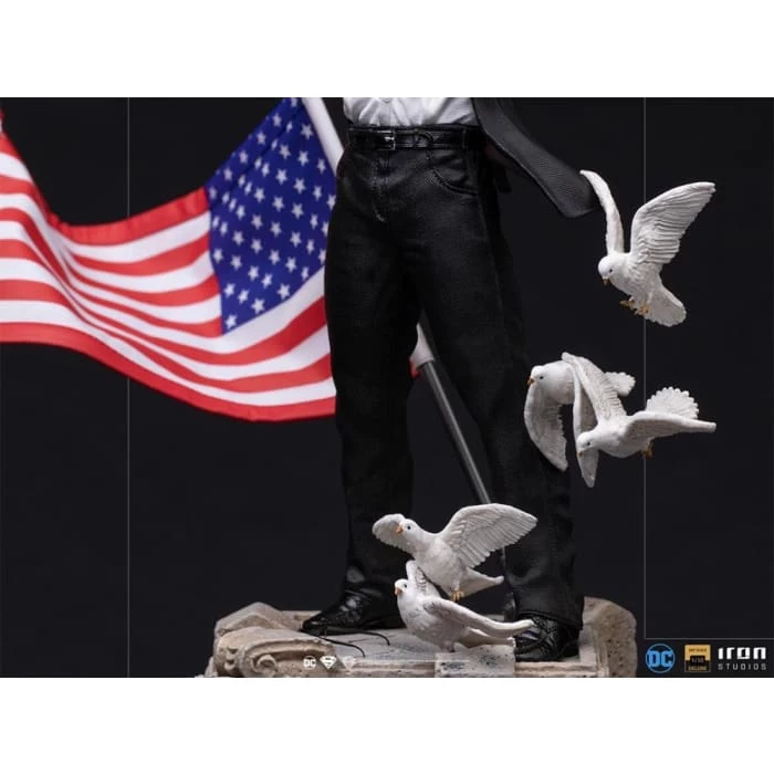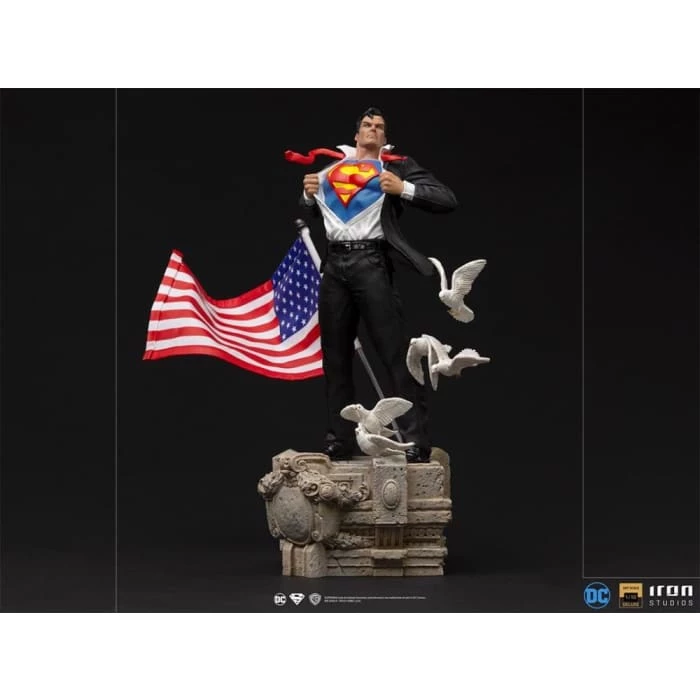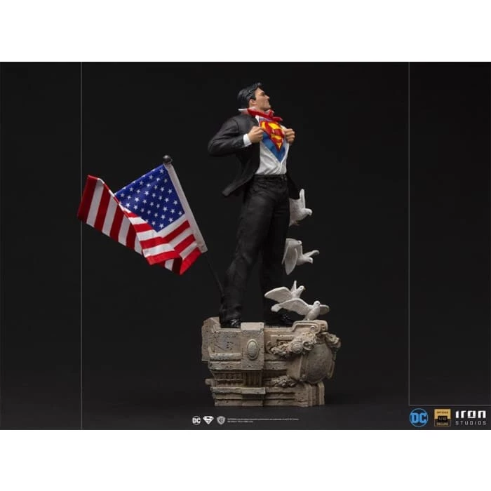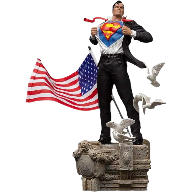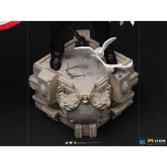 On top of a building in the big city of Metrópolis, Clark Kent, the shy reporter for the Daily Planet tabloid, glimpses the sky with a serious and thoughtful face. Focused on a distant target, he opens his shirt revealing his unmistakable red and yellow coat of arms in the shape of an “S” on his so popular blue suit. Ready to take flight, with some pigeons, a subliminal symbol of peace, and next to the flag of the USA, the nation where he was raised and which became his home, this superman, the hero of heroes, is presented by Iron Studios in a no less important version, him as a civilian.
