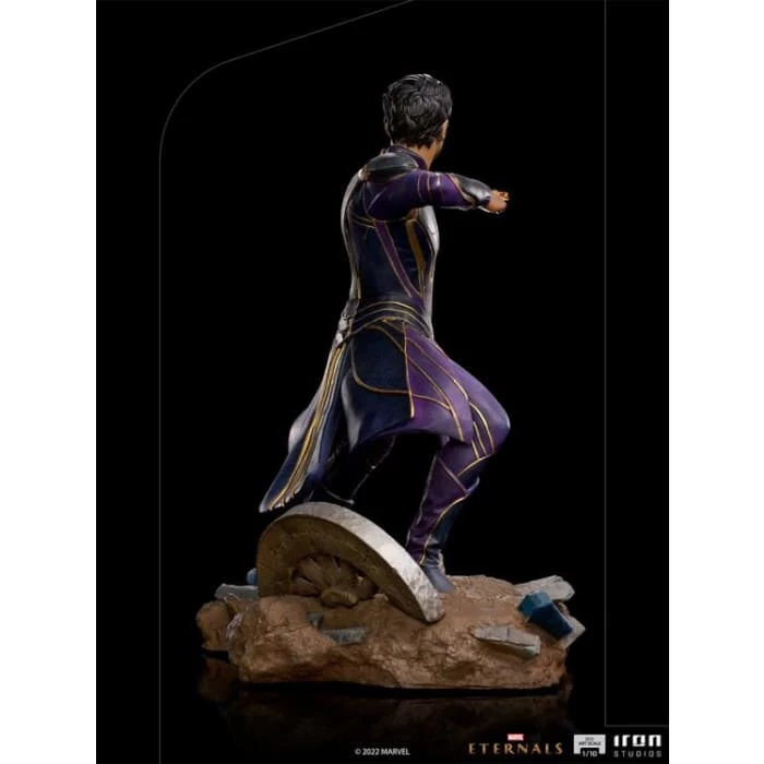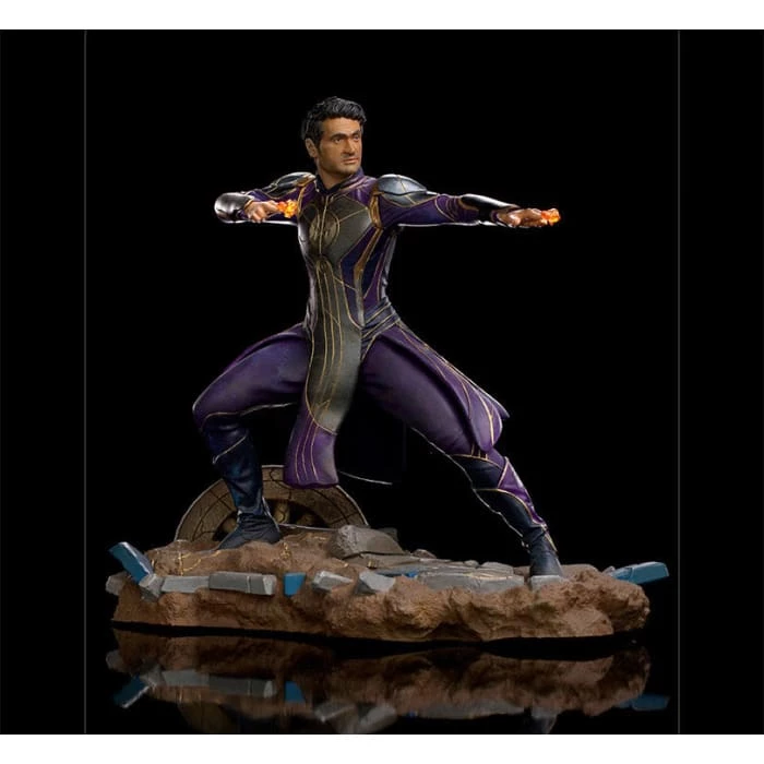 Confident and always prepared for action, he points his fingers ready to shoot spheres of cosmic energy. An extremely skillful combatant with millions of years of training and experience, he fell in love with the spotlights of fame, richness, and comfort, establishing himself in India, he becomes a famous star in the cinematic industry of Bollywood. To hide his immortality, he faked being the descendant of a single lineage of actors. With his purple celestial armor, Iron Studios bring the Kingo statue, with the actor, dancer, director, and superhero member of the Eternals in the fight against the Deviants.