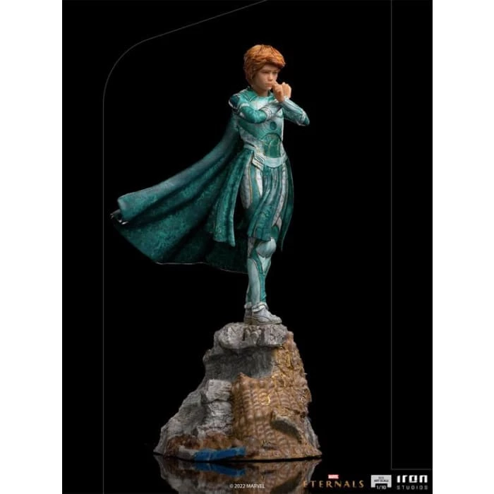 With her arms crossed in front of her small body, the fiery, playful, and sarcastic illusionist of the immortal Eternals, prepares to use her cosmic energy and abilities to create identical duplicates of herself, to change her appearance, or to create impressive and realistic illusions with sound effects. With the permanent aspect of an infantile teenager, she told stories for humanity throughout the centuries, creating many myths and legends throughout history. Wearing her turquoise celestial armor, Iron Studios bring the Sprite statue, with the small hero of red hair and acid humor of the Eternals.