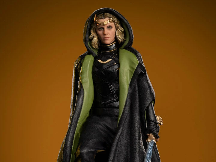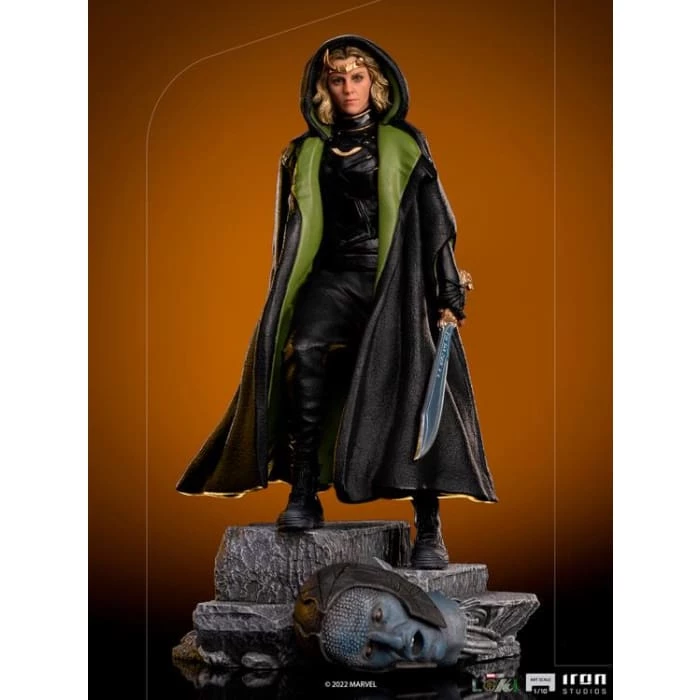 Inside the Time-Keeperโs chamber, spokespersons of the Time Variance Authority, ready to reach her objective, the Goddess of Mischief of an alternate Asgard, decapitated the head of one of the entities which turned out to be an android, concluding part of her revenge. Wielding her sword with Asgardian runes, wearing her green cloak and her golden tiara with horns (one of them broken), on a pedestal inspired by the scene described above with the robotic head at her feet, Iron Studios present the statue of Sylvie, the sorceress, Lokiโs alternate version and ally, in the series of Marvelโs charismatic villain in the movies, produced for the Disney+ streaming service.