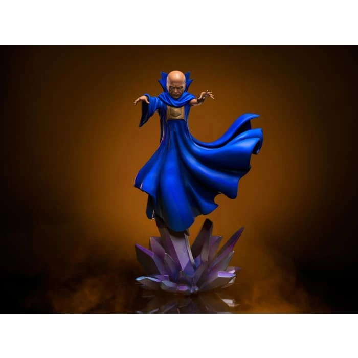 Levitating over the purple crystals of the so-called Mirror Dimension, a cosmic being with immeasurable power, aware of everything that happens in the existing universes within the multiverse and of its most emblematic inhabitants, raises his big arms using his power to circumvent the barriers between realities. Capable of identifying any diverging point in the reality thanks to his advanced intellect and omniscience, with his almost divine powers this giant established himself in the Nexus of All Realities just to watch and register the most memorable moments of each universe. With humanoid features and white eyes without pupils, he wears a big blue cloak as a uniform that indicates his status. Iron Studios proudly bring the statue of The Watcher, the narrator and guide character throughout different realities in Marvel’s multiverse in the animated series What If…?.