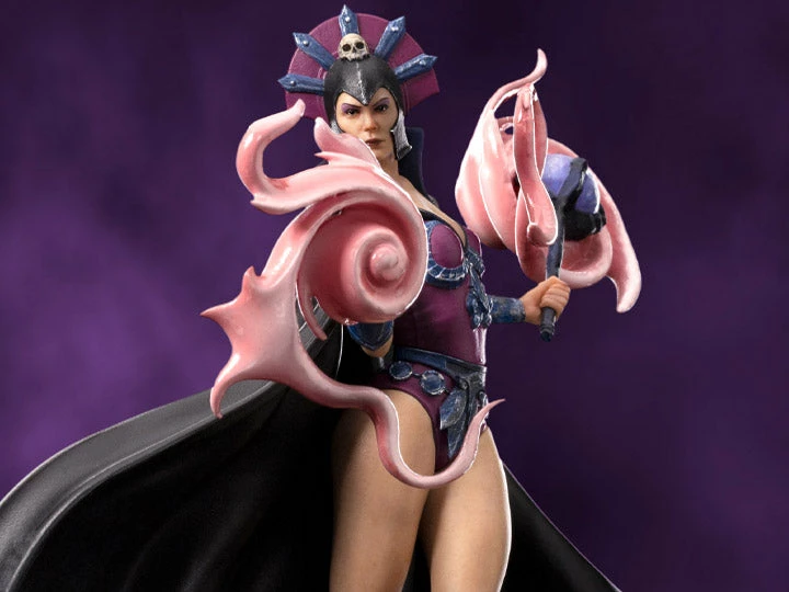 Serving as second-in-command for an evil sorcerer and as the most mighty and intelligent accomplice, the feared witch casts her magic with her mystic staff and her right hand, both forming spiral nacreous energy beams. As powerful as she is a leader, she watches over her objectives with cold and confident eyes, waiting to take advantage of her master’s powers and rule planet Eternia one day. Wearing her traditional clothes in the shape of a purple swimsuit with blue ornaments, violet boots with black ribbons, blue bracelets, and having her body covered by a black cape and her head protected by a black helmet with a crown in her suit’s colors, Iron Studios present the statue of Evil-Lyn, the most feared enemy villainess of He-Man and the Masters of the Universe, on a pedestal that refers to the evil lair on Snake Mountain.