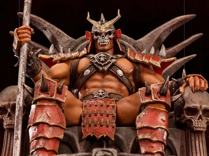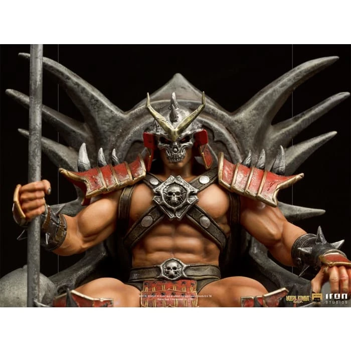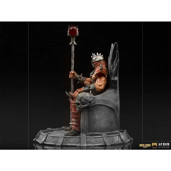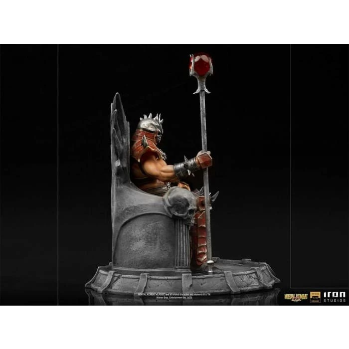 Present in his ancestral palace in the devastated kingdom of Outworld, an ancient extradimensional world ruled by chaos through his hands, the fearsome Emperor Shao Kahn reigns absolute on his throne. Wielding his staff with one of his powerful fists, while resting the other on the skull-adorned armrest of his rock-carved throne, with his face hidden by his skull-shaped helmet, the powerful world-conquering giant of one of the most popular fighting tournament games, wins its long awaited version in the Mortal Kombat line of statues from Iron Studios, inspired by Mortal Kombat II, second game of series.