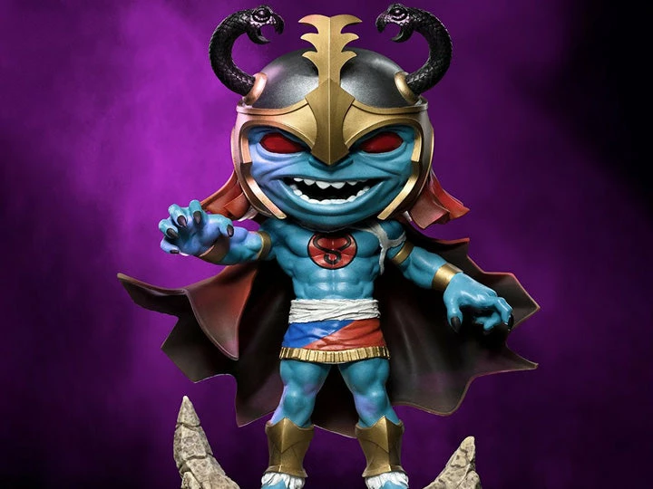 With features of an Egyptian deity, the mummified ancient Mumm-Ra controls the darkest corners of the planet known as the Third Earth. However, while summoning the power of the four entities known as the “Ancient Spirits of Evil”, his bandages brake up and he transforms into a decaying form of a giant with blue-gray skin, a muscular body, and the appearance of a pharaoh. With a helmet and a symbol on his chest in the shape of two connected snakes, he has great mystic powers linked to witchcraft, but when he sees his hideous reflection, he loses his strength and must return to the Pyramid, where he transforms back into the form of a mummy. ThunderCats’ greatest villain wishes to possess the “Eye of Thundera”, a power gem, and the source of the feline group of heroes’ survivors of planet Thundera’s powers to amplify his strength and his domains.