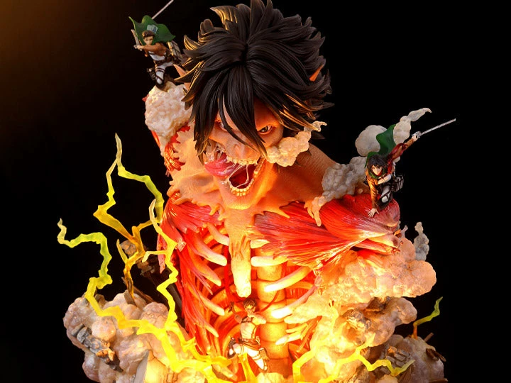 The Hope for Humanity diorama depicts Eren swinging forward and mid transformation as he bites his hand to initiate the gruesome process along with Mikasa and Levi on the Titan’s shoulders.