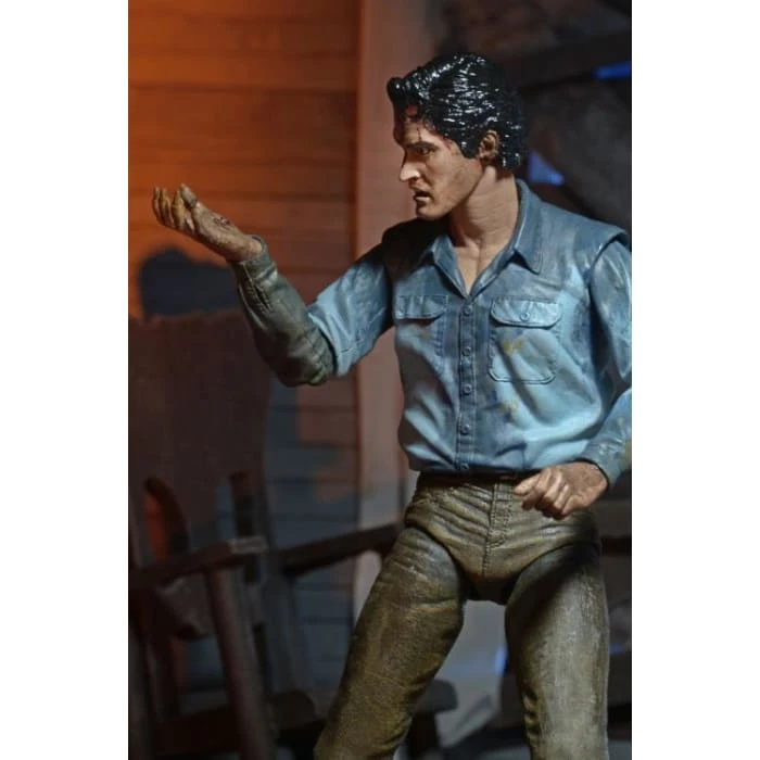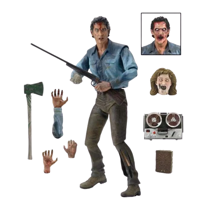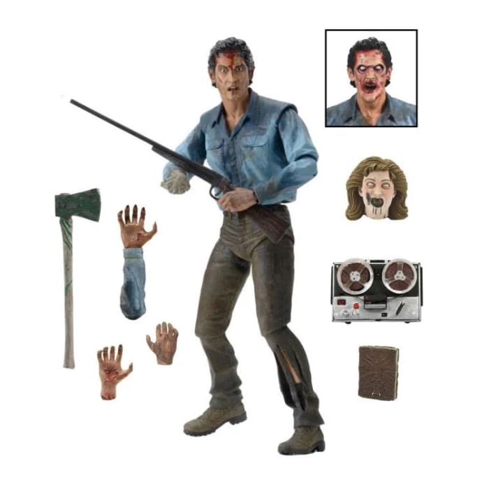 Ultimate Ash features all new fully articulated legs and tons of accessories, including 2 interchangeable heads (regular and possessed sculpts), interchangeable right forearms, severed possessed hand, Sheila head, Necronomicon, tape recording machine, shotgun and axe accessories.