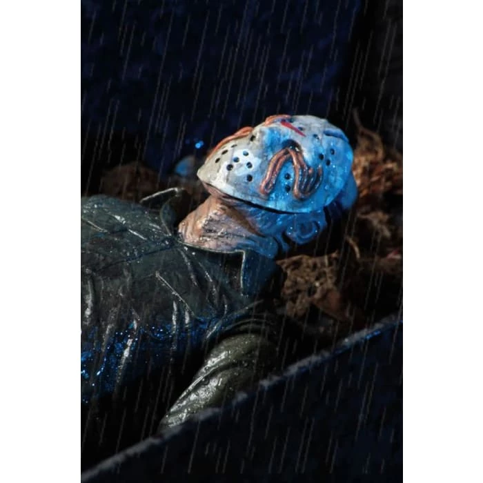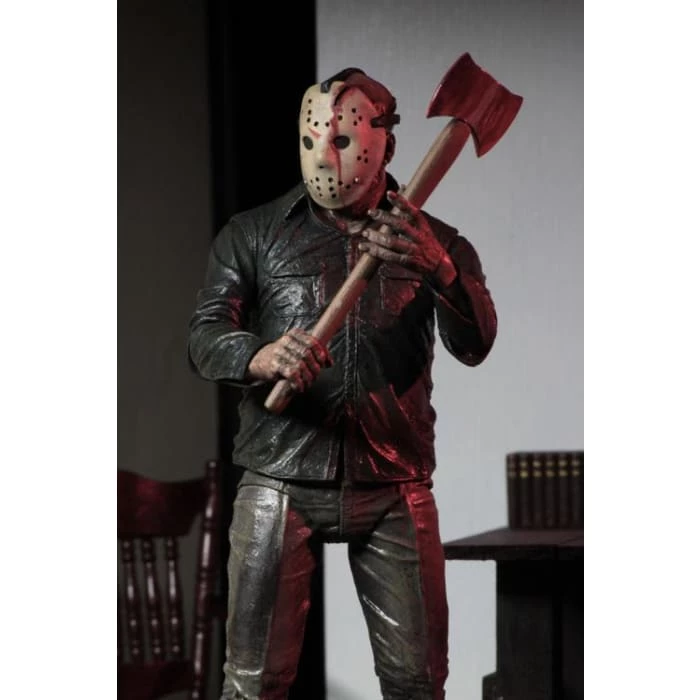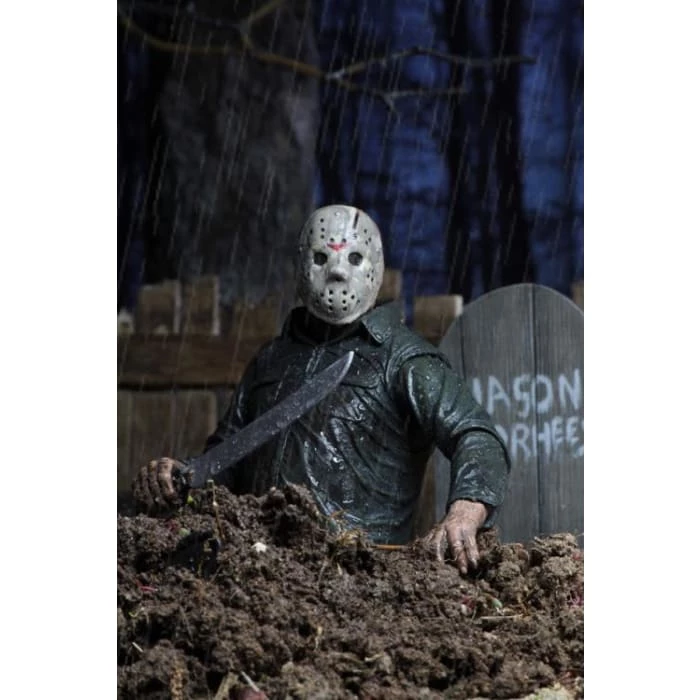 It’s also packed with accessories–machete, axe, ice pick, and tombstone. Bonus: includes an extra left hand with split fingers that can be used with this figure or the Ultimate Part 4 Jason! Comes in a display-friendly deluxe window box with opening flap.