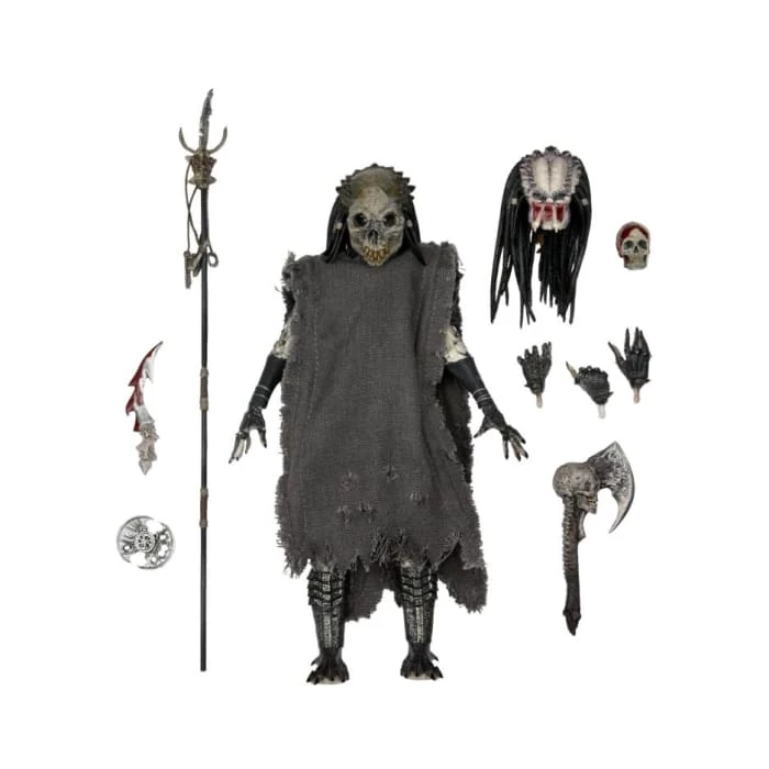 Includes cloak, staff, bone necklace, ritual dagger, open throwing disc, human skull, hatcheted skull, masked and unmasked heads, plus interchangeable hands.