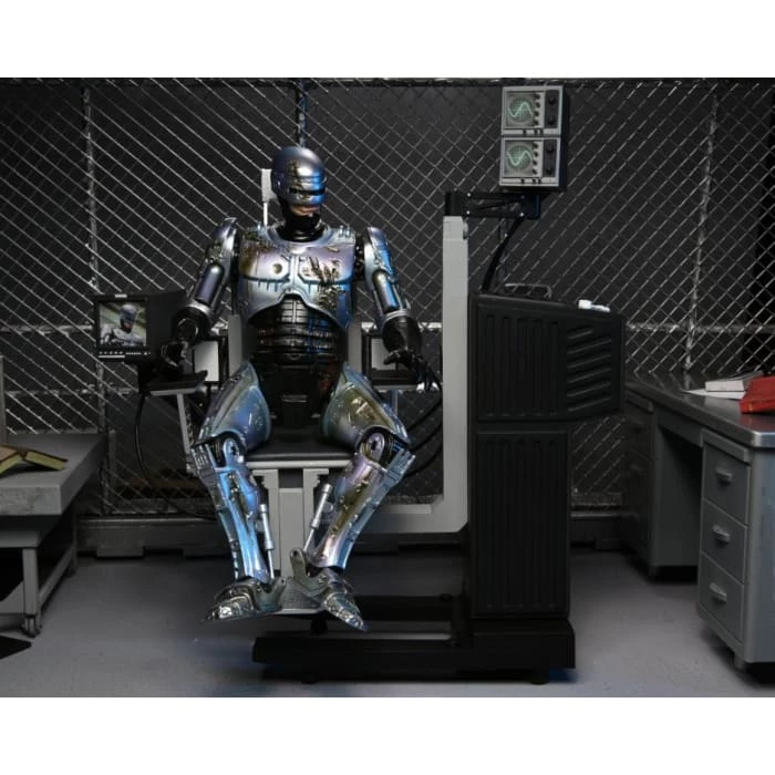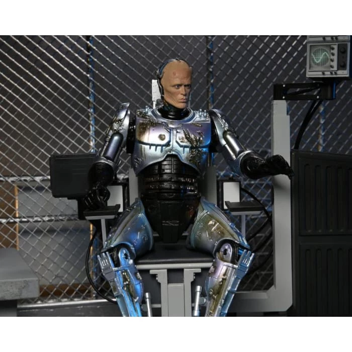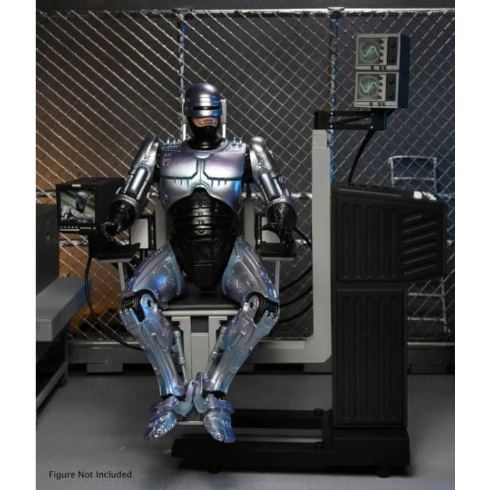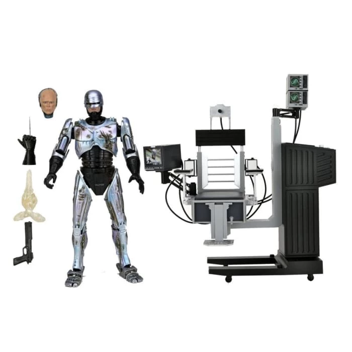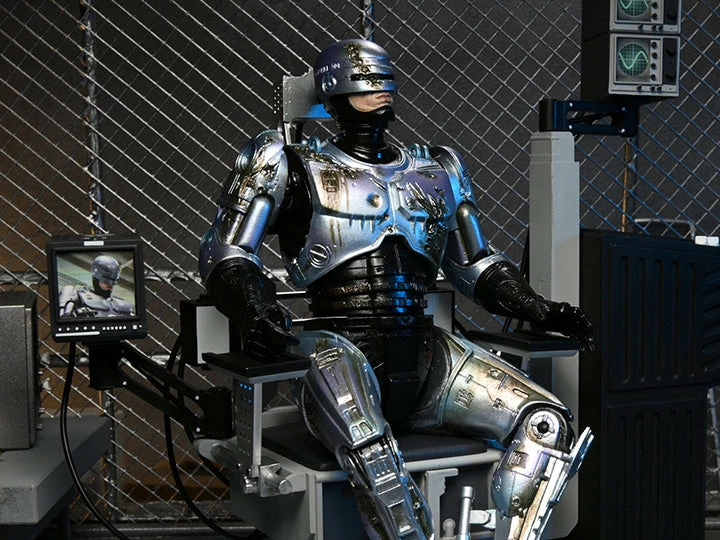 After fighting baddies all day, dock the 7″ scale Ultimate Battle-Damaged RoboCop figure in the included screen-accurate chair with movable elements. The chair is over 8″ tall, over 7″ wide, and has swiveling seat as well as articulated swiveling monitors! RoboCop comes with even more accessories, too: interchangeable data spike fist, Auto-9 pistol, attachable muzzle blast effect, and an additional interchangeable head with the likeness of Peter Weller. Featuring upgraded deco and digital printing.