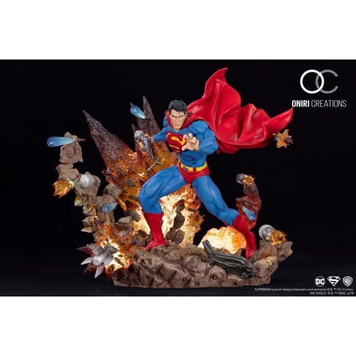 From Oniri Creations, the Superman: For Tomorrow statue is based on the cover art of Superman #205. Standing over 13 inches tall, Superman is depicted defending himself against a full-on attack of bullets and rockets. Superman stands atop a highly detailed base of destruction and debris and features semi-translucent flames.
