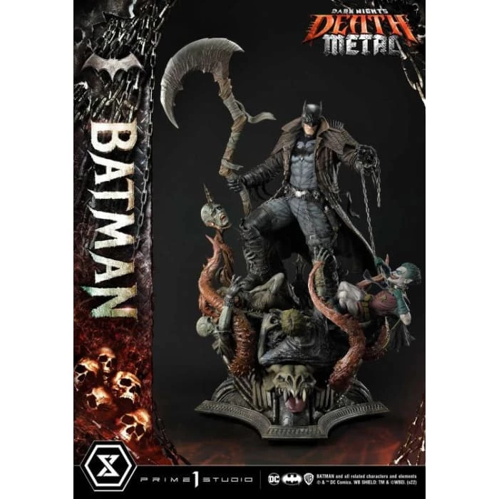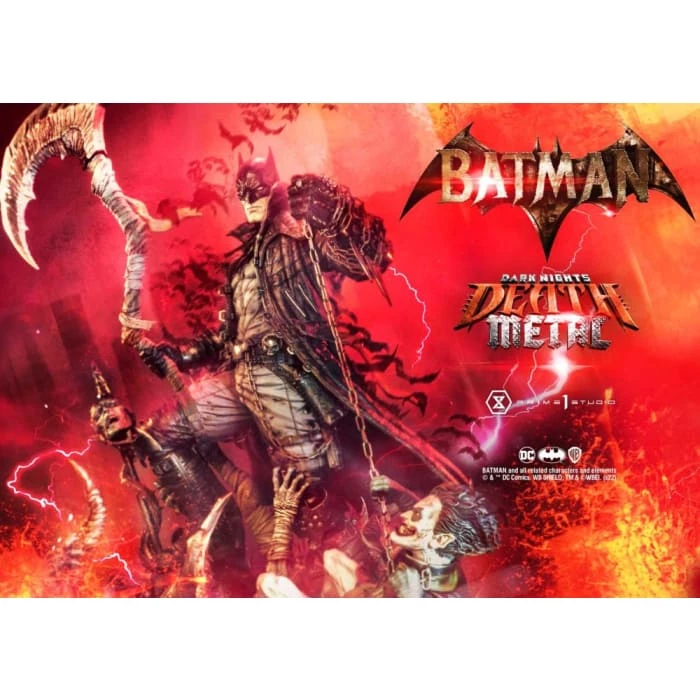 Prime 1 Studio has crafted a Batman at his most dangerous! At a commanding 41 inches tall, he has shed every pretense of subtlety! Batman has covered himself in a grungy, bat-like leather trench coat with over large shoulder spikes, solid metal bracers with razor-sharp fins, and an industrial strength utility belt chained to the toughest-looking, butt-kicking boots! In the books, his trench coat grants Batman the power to cloak himself from detection. The Dark Knight has taken it upon himself to become a post-apocalyptic Grim Reaper by wielding a giant scythe as his signature weapon! Most of all, he has found himself the owner of a powerful Black Lantern ring, allowing him to command an inexhaustible supply of reanimated corpses: his Undead Army!