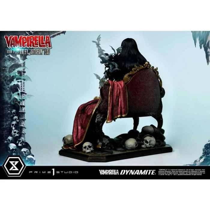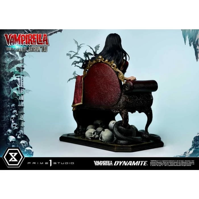 Hot from the pages of Dynamite’s thrilling monthly comic, VAMPIRELLA comes to you from the fantastic mind of Stanley Lau and the impressive artistry of Prime 1 Studio! Based on Vampirella No. 6’s famous Artgerm cover, Prime 1 Studio’s 22-inch tall Vampirella statue carries on with the theme of Vampi unwinding by herself on a finely appointed chaise lounge base, adorned with the familiars and accessories of her world.