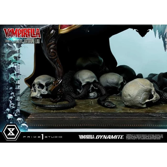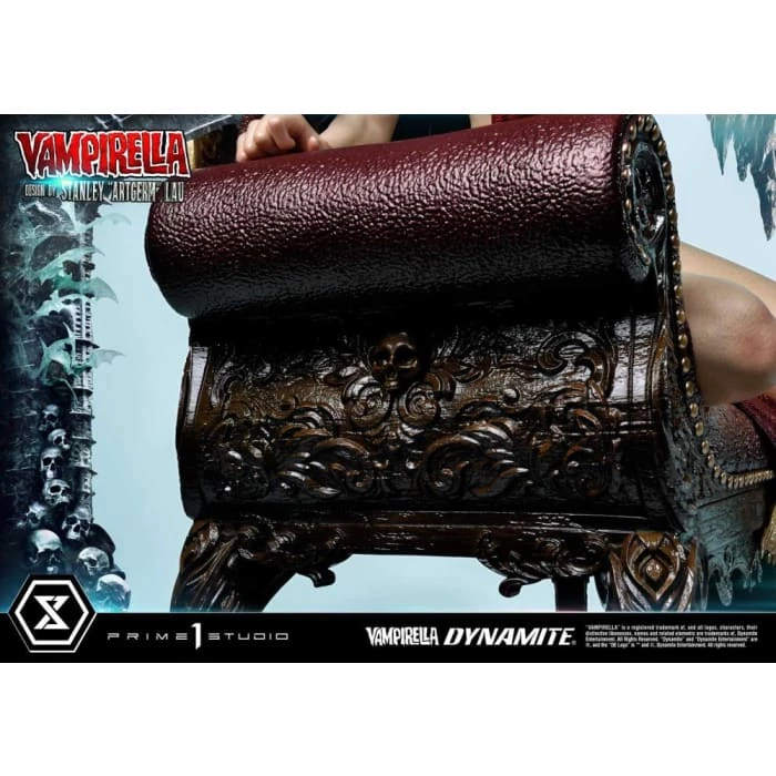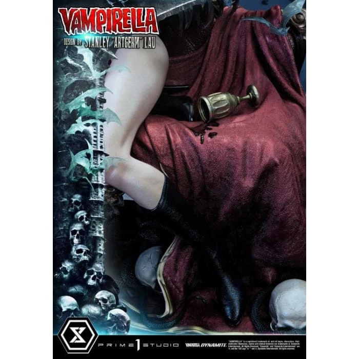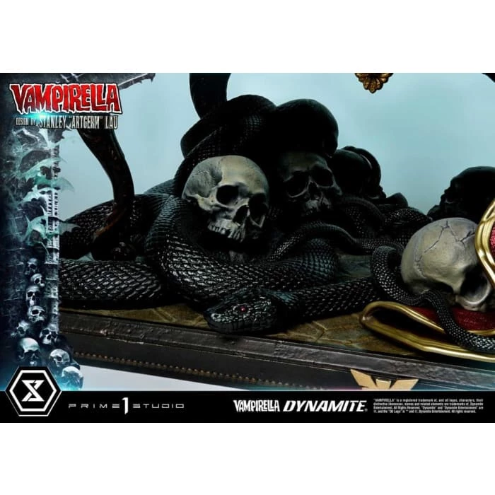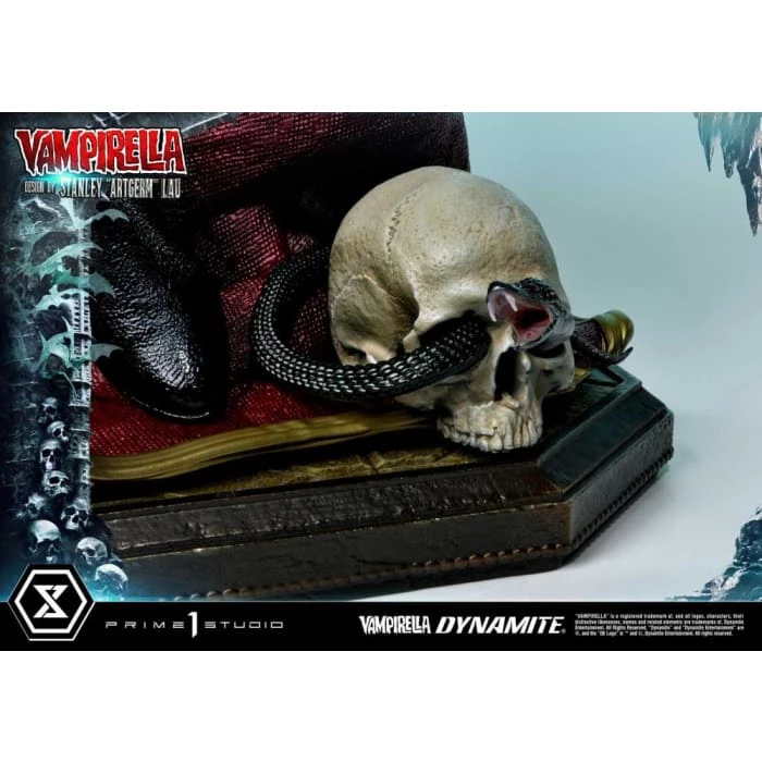 The chaise that Vampirella lounges on supports her relaxed demeanor very well. It features quilted leather, fine wooden carvings, and a large textured throw blanket. A goblet of spilled blood adorns the blanket, while a small, rising colony of bats balances her out very well. Encircling Vampirella’s fine leather boots are some venomous snakes slithering between a dozen or so human skulls. Moreover, if you order from Prime 1 Studio’s online store and authorized distributor, you will get a displayable Vampirella logo as a bonus.