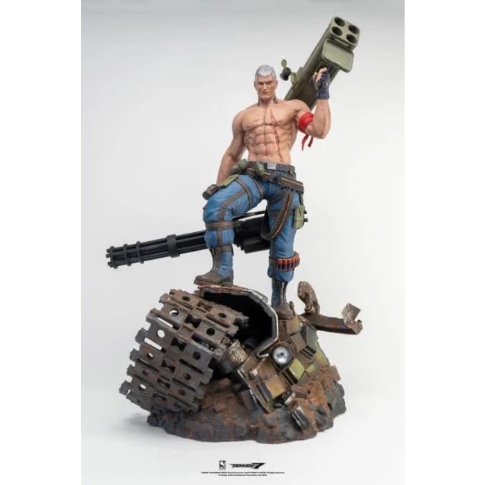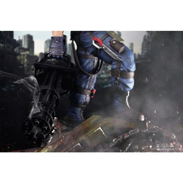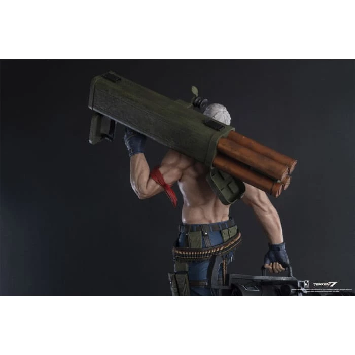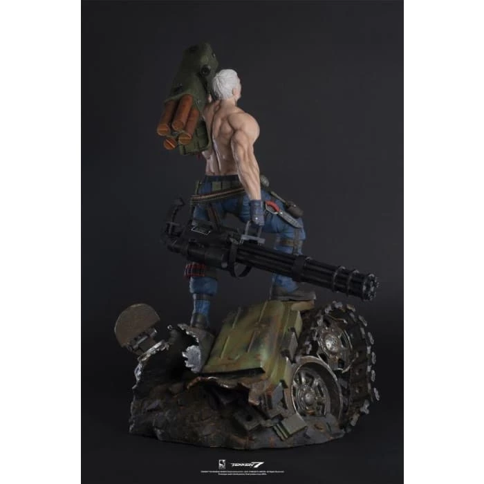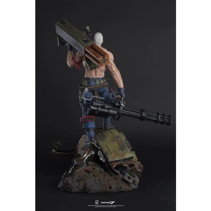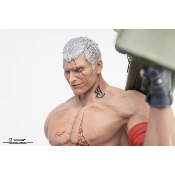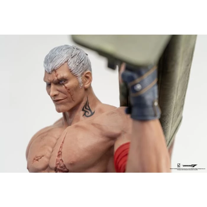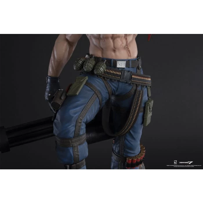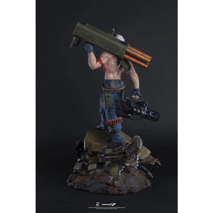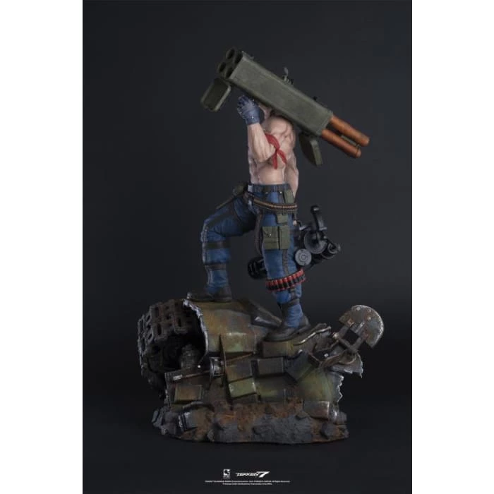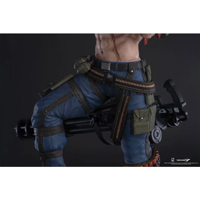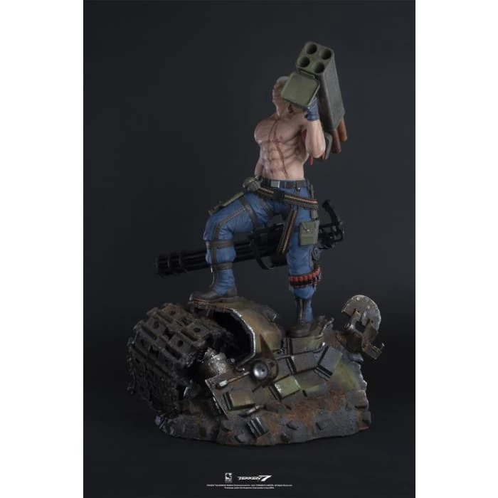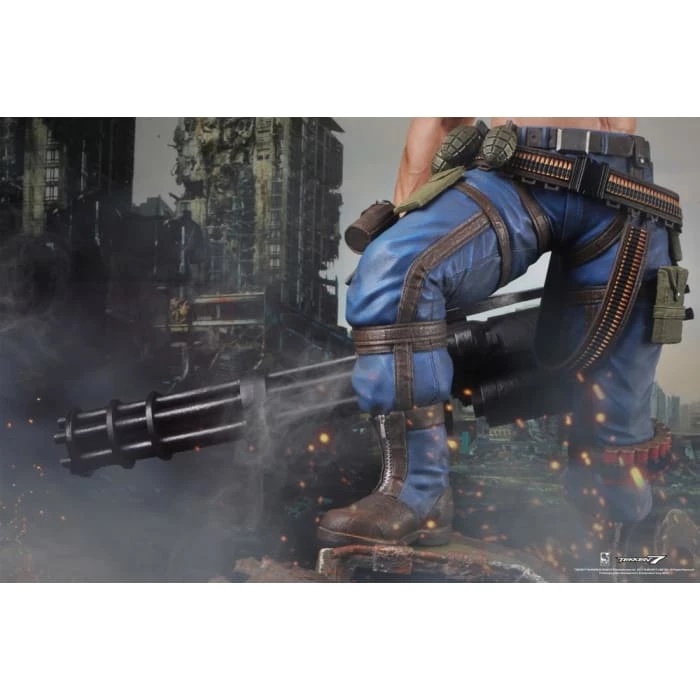 This highly detailed 1/4 scale statue of Bryan Fury, one of the most iconic fighters of the Tekken franchise, is sculpted on a battlefield in its original outfit. He’s holding his iconic heavy weapons, ready for a fight and standing fiercely over the remains of a tank. He is portrayed with his famous expression, wearing his charismatic evil smile.