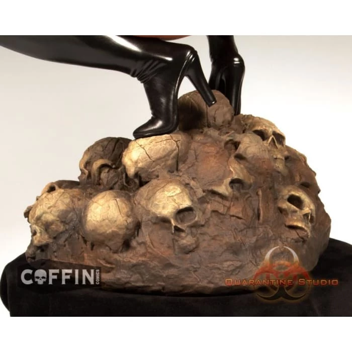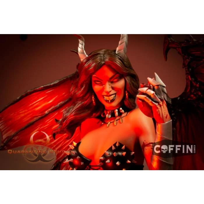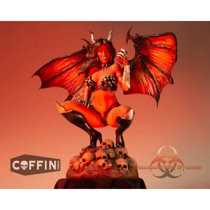 Based on artwork by Mike Krome, Hellwitch crouches atop a pile of ash and bone clutching the heart of her last victim. Measuring 14.5โ to the tip of her horns, she displays her impressive 17.5โ wingspan. Time to make space in your display case because this statue is gonna need some room. Every detail is there from her thigh high boots and armored gauntlet to that come hither smile that lets you know she is up to no good.