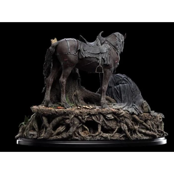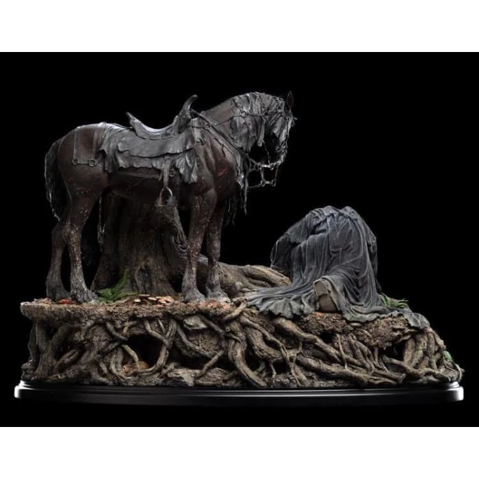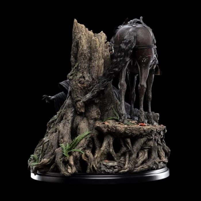 No sooner have the Hobbits scurried over an embankment and sought shelter beneath the eroded roots of an old tree when a tall, black-robed figure emerges from the mist. Dismounting its midnight horse to sniff unnaturally at the air, the stooped, black-cowled creature sweeps this way and that, drawn inexorably toward the huddled Shirelings.
