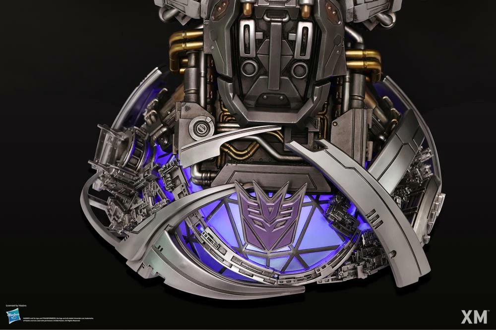 Boasting an amazingly detailed mix of both modern and classic design elements from the G1 animated series, this 1/3 scale bust of the leader of the Decepticons features futuristic Cybertronian elements within the base, with the Decepticon logo featured prominently at the front.